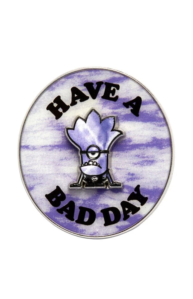 A mischievous and grumpy Evil Minion is featured on this pin to tell you to “Have a Bad Day.”