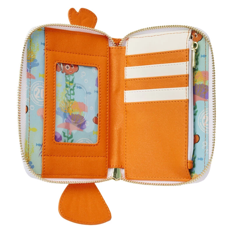 The Exclusive Loungefly Finding Nemo 20th Anniversary Nemo Zip Around Wallet is made of vegan leather (polyurethane). Wallet zips closed with sturdy metal hardware and includes five slots for holding cards with a clear slot to hold ID. Additional features include applique, embossed, and printed details. Take note of the coordinating inside lining.
