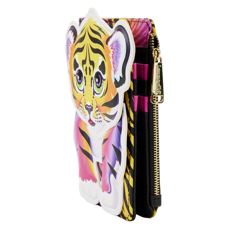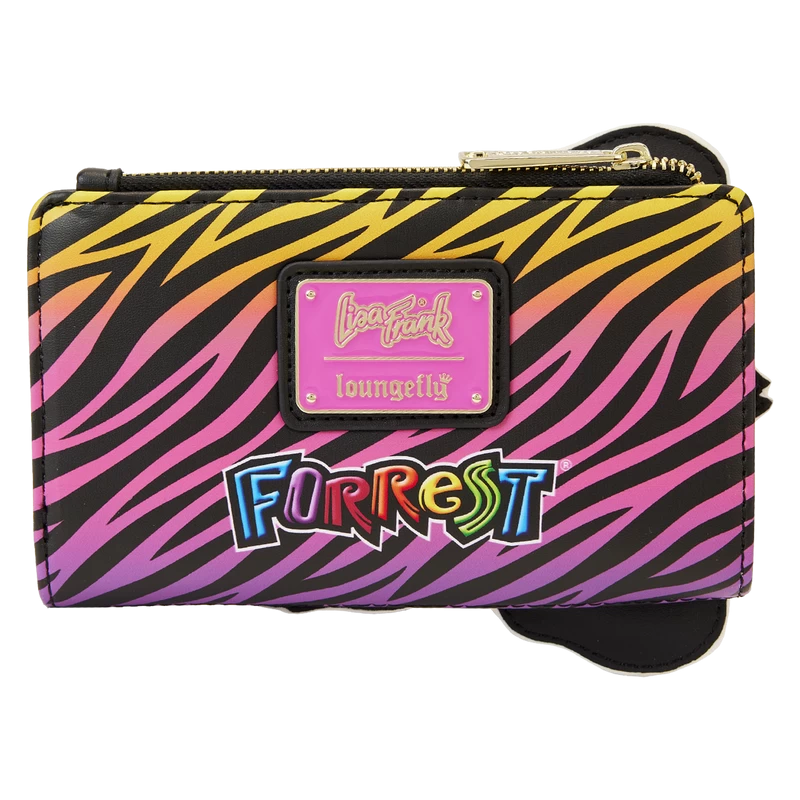 The Loungefly Lisa Frank Forrest Cosplay Flap Wallet is made of vegan leather (polyurethane). Wallet includes shiny gold hardware with plenty of snaps and zippers to keep everything in place. Additional features include applique, embroidered, debossed, and printed details. Take note of the coordinating inside lining.