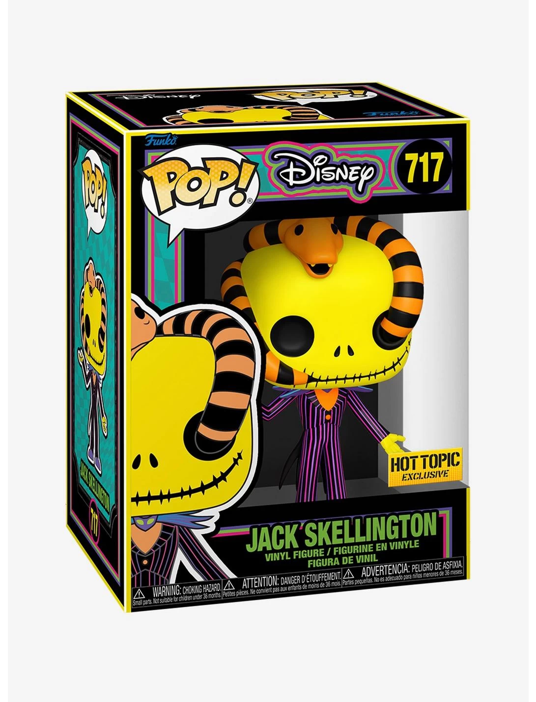 Beware of creepy crawlies! The exclusive Pop! Jack Skellington has slithered its way into our collection. Jack is depicted in vivid colors that are designed to shine brightly under blacklight, and with a snake slithering through his skeleton head. He’s sure to provide thrills and chills to your The Nightmare Before Christmas collection.