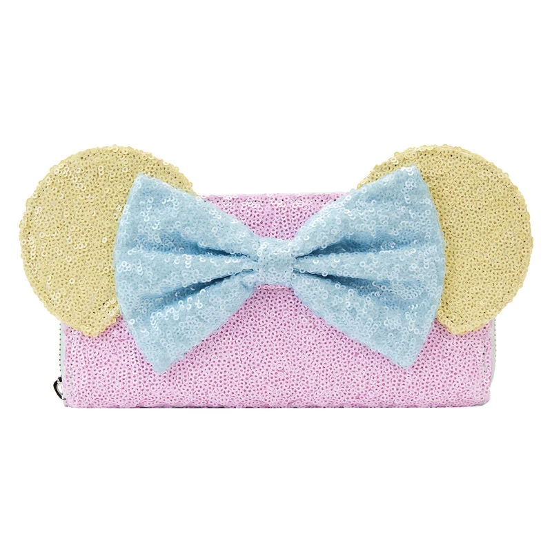 Take an extra sparkly bow! Shine with our exclusive Loungefly Disney Minnie Mouse Pastel Zip Around Wallet. Minnie Mouse’s signature 3D applique bow, on the front of this accessory, is covered in blue sequins. Her pastel yellow sequined ears pair perfectly with an array of glittery soft colors on all sides. Inside, you’ll find plenty of room for keeping your valuables secure. There are 8 slots for holding cards and 1 clear slot for displaying your ID. It’s the perfect accessory for showing off your sparkling personality while turning everyday outings into enchanting adventures. Act fast to collect this 1,600-piece limited edition Loungefly exclusive.