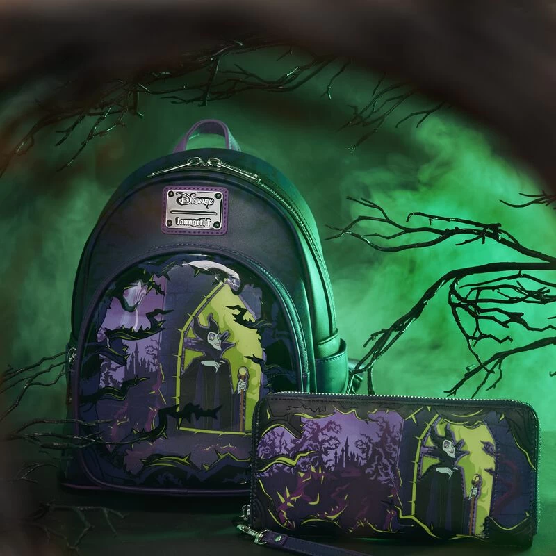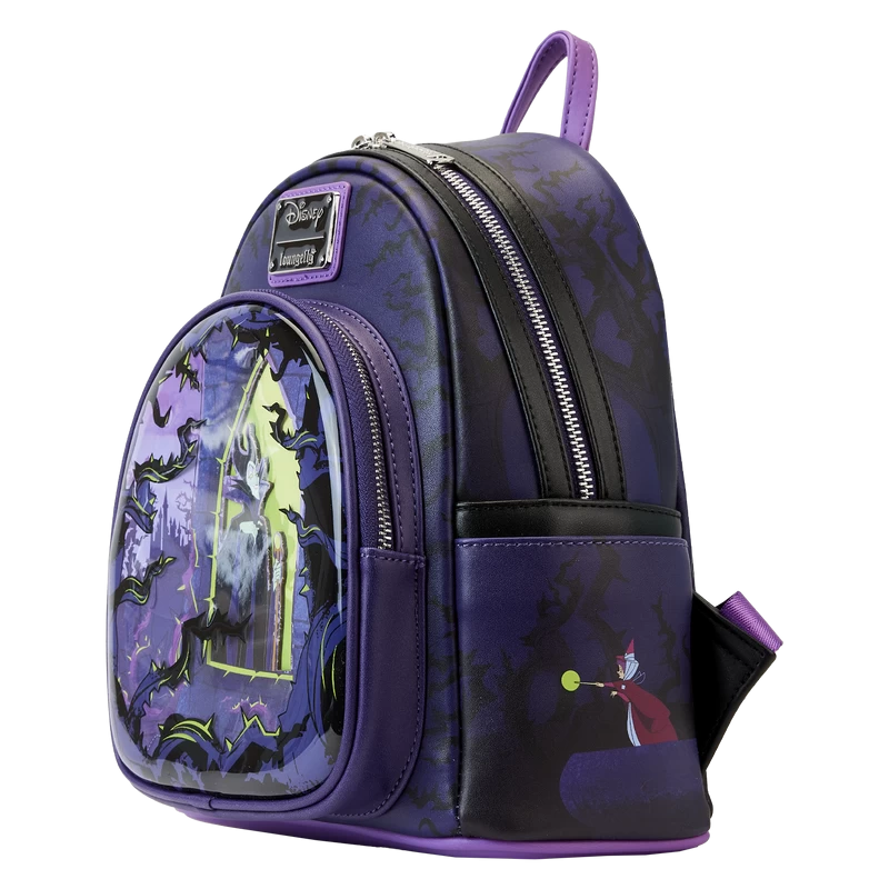 Bring the fire—and the reign! Embrace your dark side in style with our exclusive Loungefly Disney Maleficent Window Box Mini Backpack. On the front, Maleficent appears in an upper tower of her castle, cast in an eerie glow. A clear plastic dome, over the applique scene on the zipped front pocket, provides a window view. Thorns rise up around Maleficent as she carries out her evil plans. Scenes from this climactic moment of Sleeping Beauty continue on the side panels as Flora, Fauna, and Merryweather use their powers to stop Maleficent. On the back, Merriweather turns Maleficent’s raven into stone. In the dark, this backpack glows on the front and side panels. The dramatic light behind Maleficent shows up in the dark, along with the outlines of thorns, and the orbs of light from the wands of the three Good Fairies. Turn everyday outings into frightfully fun adventures with this terrifyingly terrific accessory. Act fast to collect this 1,300-piece limited edition Loungefly exclusive.