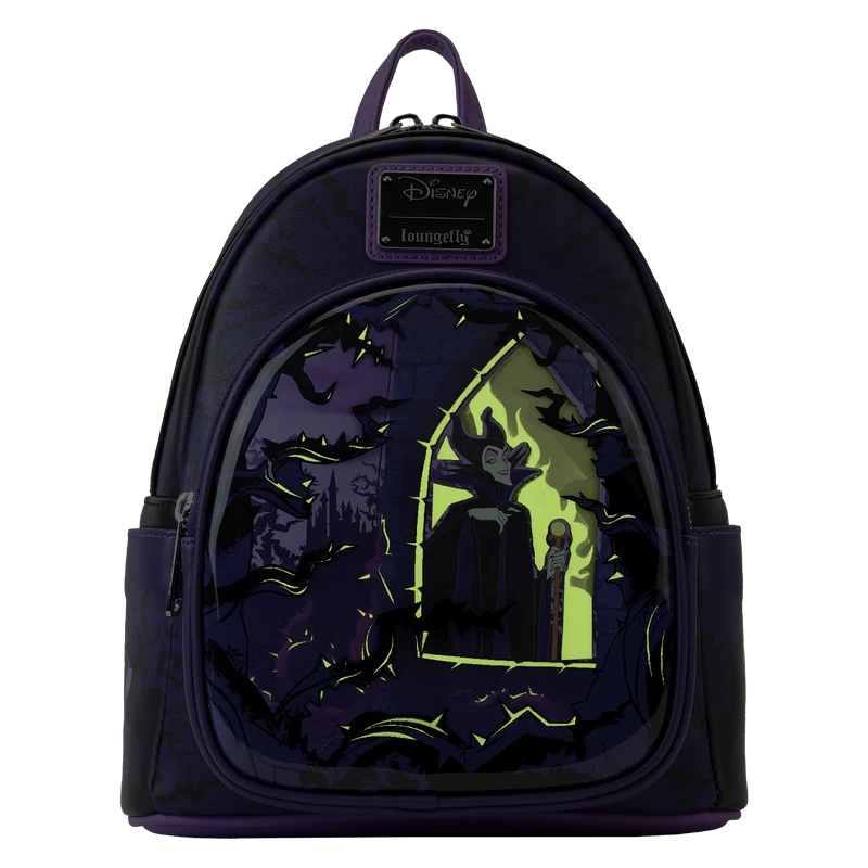 The Loungefly Disney Maleficent Window Box Mini Backpack is made of vegan leather (polyurethane). Bag has adjustable shoulder straps, a PVC dome, side pockets, and shiny silver-colored metal hardware. Additional features include applique, glow-in-the-dark, and printed details. Take note of the coordinating inside lining.