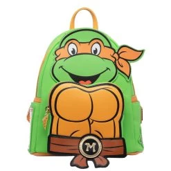 Get ready to kick some shell! Introducing the 707 Street Exclusive – Loungefly Nickelodeon TMNT Michelangelo Cosplay Mini Backpack. This faux leather Loungefly mini backpack features Michelangelo from the pizza-loving, crime-fighting group the Teenage Mutant Ninja Turtles. You’ll find a green-colored base with pops of orange. The front pocket features his muscular, bottom shell with a belt and the letter “M”. You’ll find a pepperoni pizza slice as the zipper pull and a pizza box on one side pocket with the TMNT logo on the other. The back of the bag features the top of his shell too! Grab your nunchucks – this bag has everything you need for another day of saving the city!