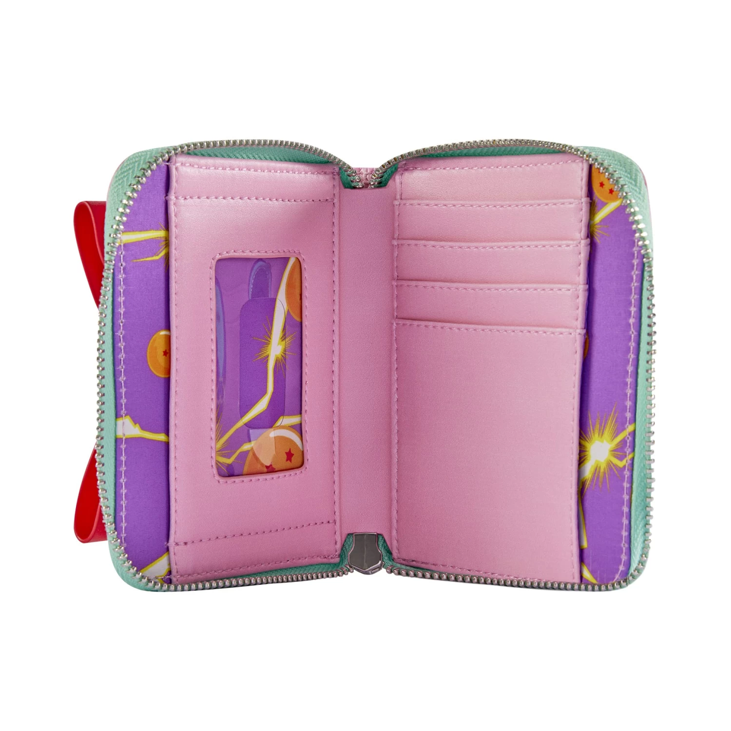 Loungefly has recreated Bulma’s iconic pink dress from Dragon Ball in wallet form! The body of the wallet mimics the pink of Bulma’s dress, complete with her name emblazoned across the front. The edge of the zipper brings the classic mint green of Bulma’s hair to life. All this is perfected with the beautiful 3D red bow, just like the one Bulma wears in her hair! Inside, the theme continues with unique Dragon Ball lining. Wallet is approximately 5.5” wide and 4” tall, made of quality vegan leather and shiny metal hardware. Wallet has 4 credit card slots and clear ID slot.