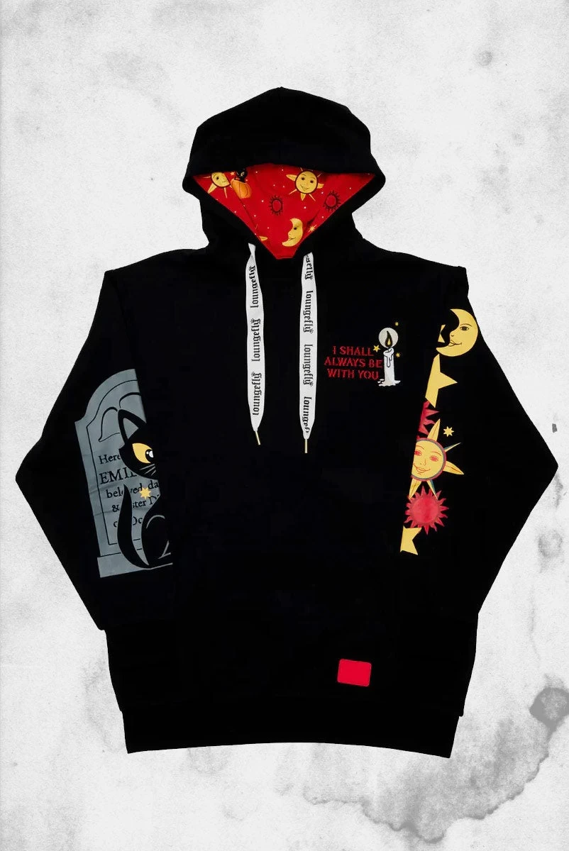 Celebrate the magic of All Hallows Eve with the Loungefly Hocus Pocus Binx Hoodie. This charmingly cozy hoodie pays tribute to the special bond between Thackery Binx and Dani Dennison from Disney’s Halloween classic, Hocus Pocus. On the front, the phrase “I shall always be with you” is displayed next to an embroidered black flame candle. The left sleeve features Thackery Binx in his black cat form, while the right sleeve shows sun, moon, and star motifs inspired by Dani’s witch costume. With original artwork and screen-printed details, this hoodie will keep you comfortable and stylish as you run amuck on your adventures.