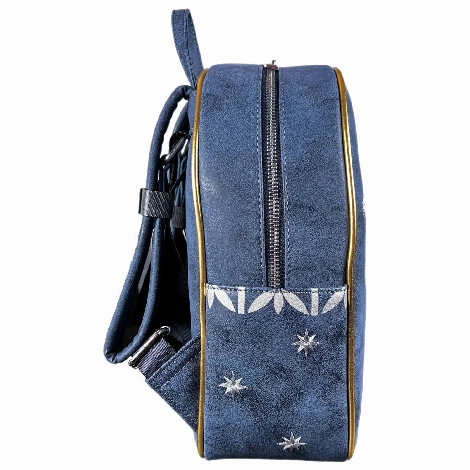 Dark blue cowboy “leather”, trimmed in gold with The Evenstar necklace zipper charm. The lining is a pattern of the Tree of Gondor and The Crown of Gondor.