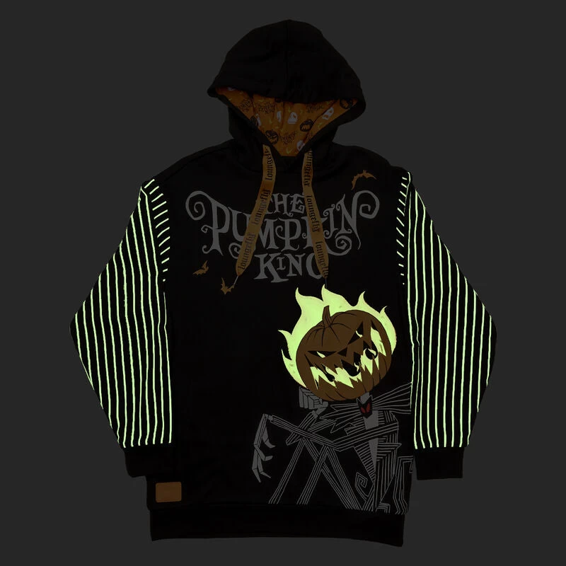 The Loungefly Nightmare Before Christmas Pumpkin King Hoodie is made of French Terry cotton (60% cotton, 40% polyester). Extra-large lanyard-style drawcords add versatility in wear and fit and are perfect for displaying your favorite pins. Cuffs and waistband are 95% cotton and 5% Spandex.