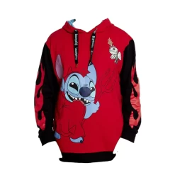 The Loungefly Disney Stitch Devil Hoodie is made of French terry fabric (60% cotton, 40% polyester). Additional features include an extra-large, lanyard-style drawcord and a lined hood.