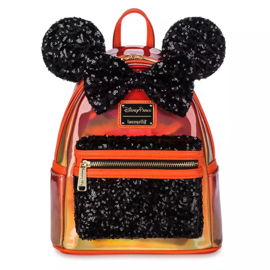 Minnie fans will take a shine to this glamorous mini backpack from Loungefly. The iridescent glossy vinyl shell has a two-tone orange and yellow appearance depending on how it catches the light. This contrasts dramatically with the black sequins on the 3D ears, bow and front pocket, creating a frightfully fashionable bag with a haunting Halloween color scheme.