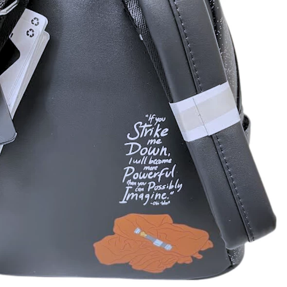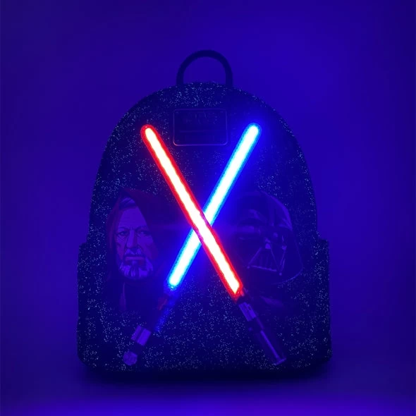 Features: Side pockets, adjustable shoulder straps, silver hardware, glow-in-the-dark stars, LED strip lights, and printed details.