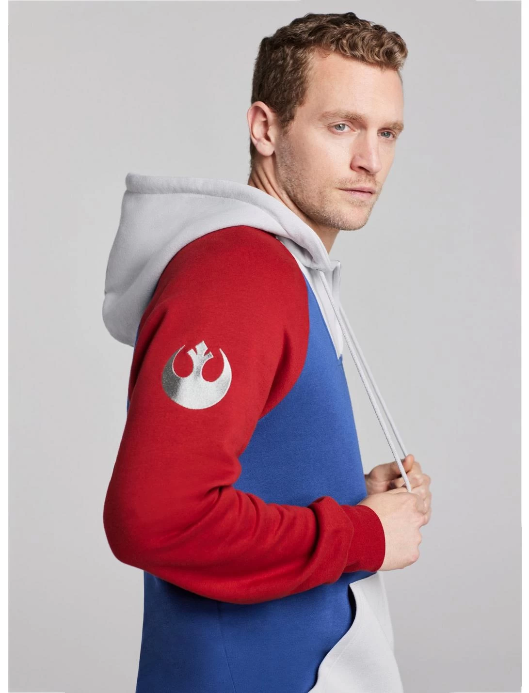 Dress just like Skyguy! Get ready for chilly weather in this Star Wars hoodie! Inspired by Anakin Skywalker’s armor in The Clone Wars, this hoodie features red, blue and grey color blocking, plus the Rebel logo embroidered on the right sleeve. Comes with a partial front zipper, drawstring hood and kangaroo pocket.