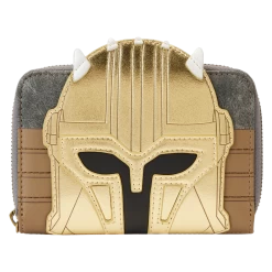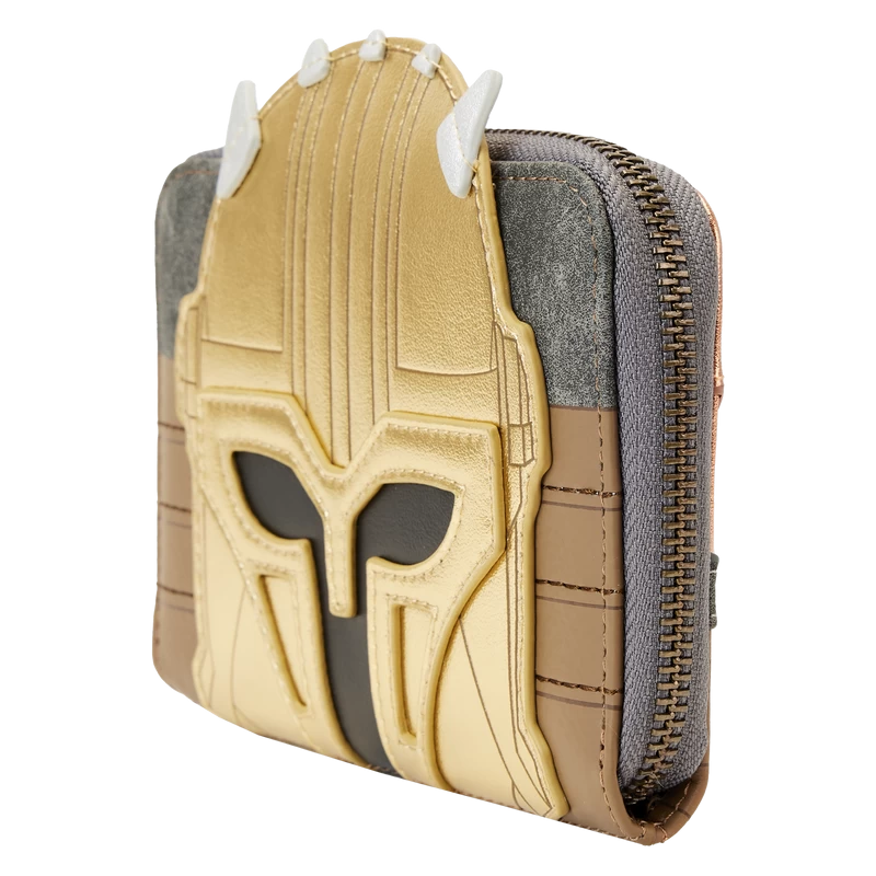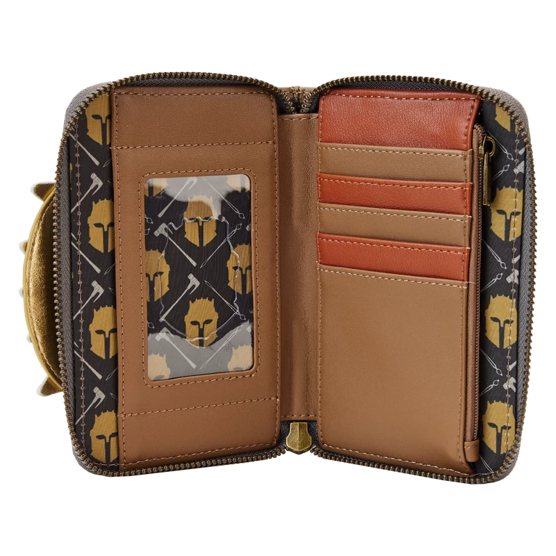 The Star Wars Celebration Exclusive Loungefly Armorer Cosplay Zip Around Wallet is made of vegan leather (polyurethane). Wallet zips closed with antique brass hardware and includes five slots for holding cards, plus a clear slot for holding ID. Additional features include applique, debossed, metallic, top stitched, and printed details. Take note of the coordinating inside lining.