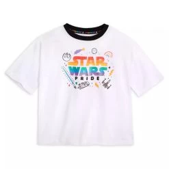 It’s a celebration for the galaxies with this Star Wars fashion top. Full of color and charm, it features the film’s rainbow logo surrounded by stylized icons including a Lightsaber, the Millennium Falcon, an X-wing starfighter and more on the front. The rainbow Starbord insignia is printed on the pretty petal back. Accented with a special neck tape and contrast ribbed collar, this semi-cropped jersey top is so cute it brings out the stars, the moon and rainbows too.