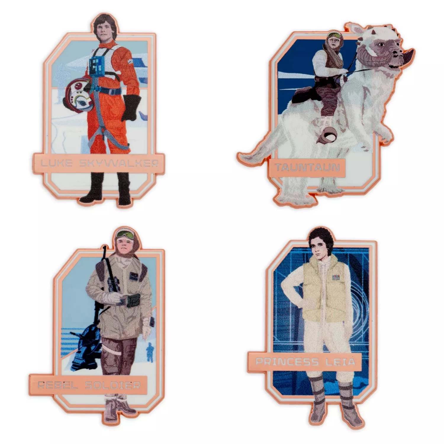 Planet hop to Hoth with this mystery pin set featuring denizens of the Star Wars snow planet. Each blind pack contains two randomly selected pins from a possibility of 12 different designs. This cool series will warm your heart (Tauntaun carcass required)!