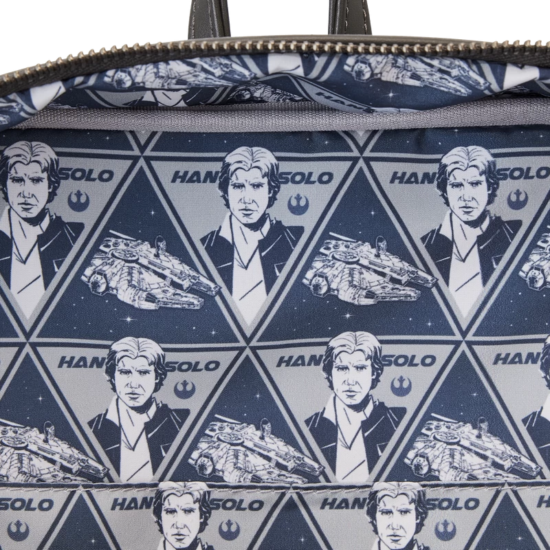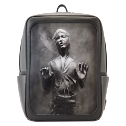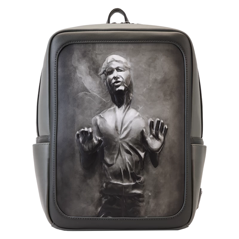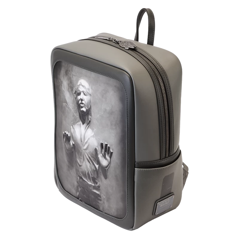 The Loungefly Star Wars™: Return Of The Jedi™ Han Solo in Carbonite Mini Backpack is made of vegan leather (polyurethane). Bag has adjustable shoulder straps, sturdy metal hardware, metal zipper charm, and features: 3D molded, debossed, applique, printed details. Take note of the coordinating inside lining.