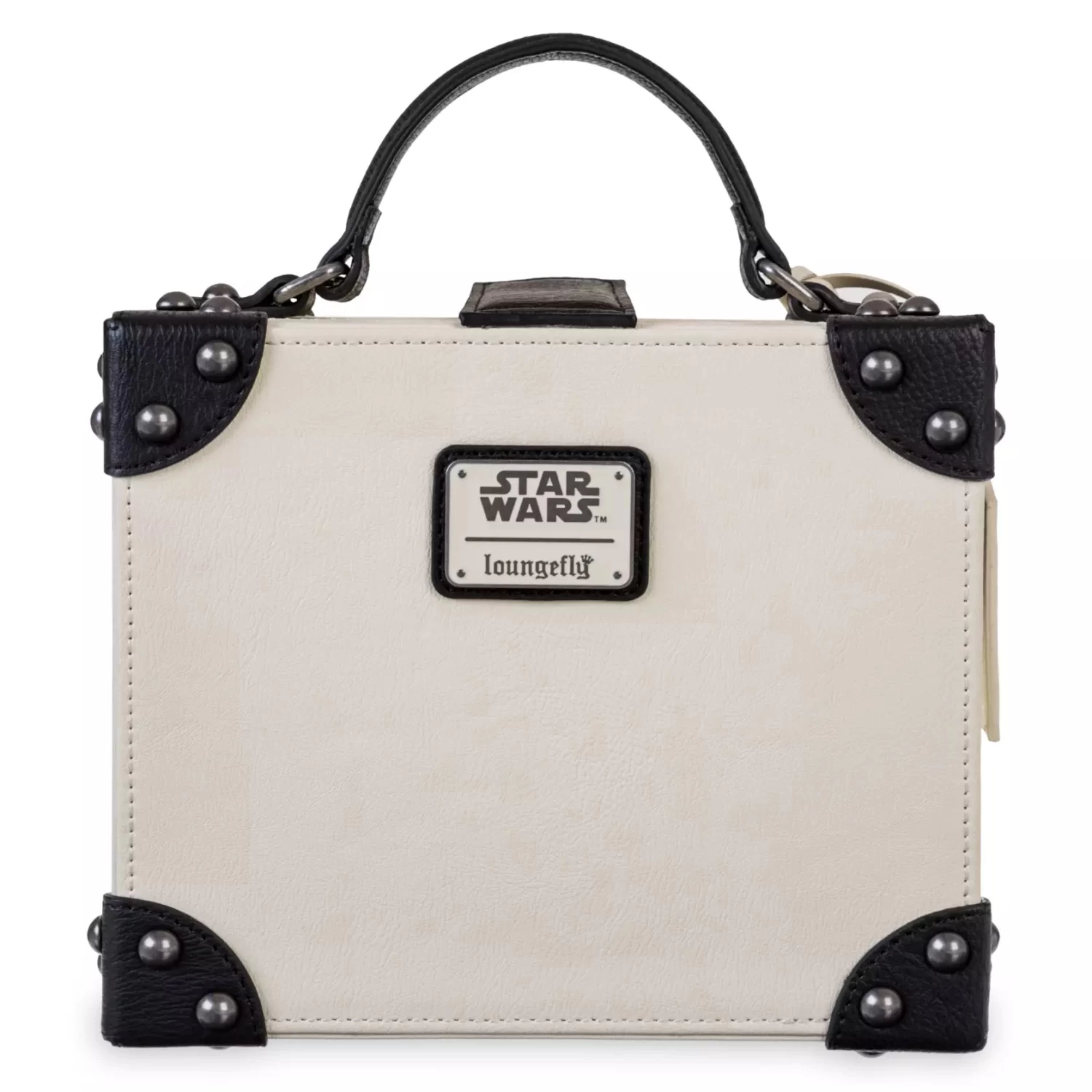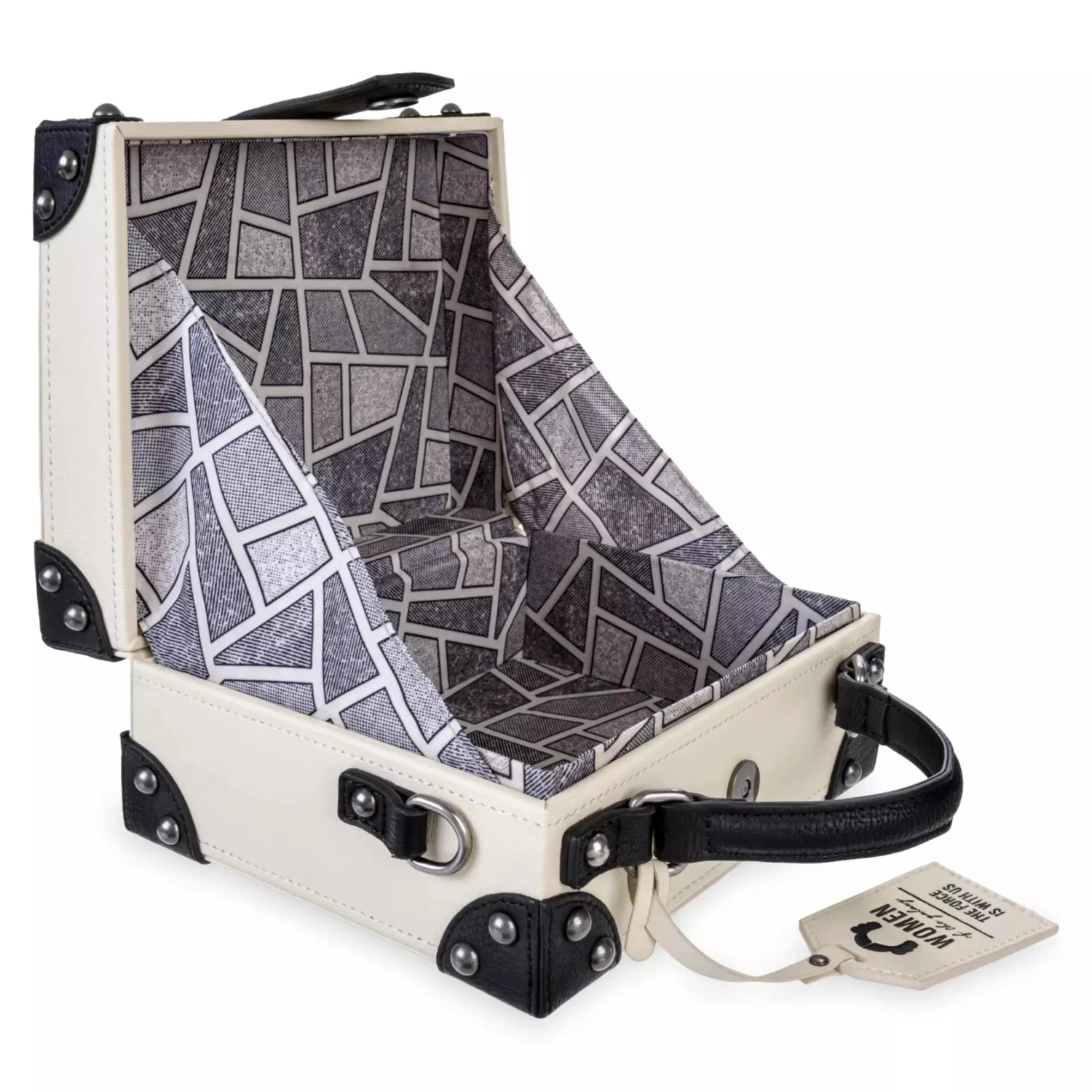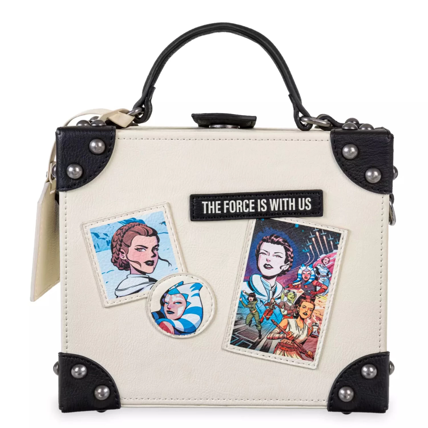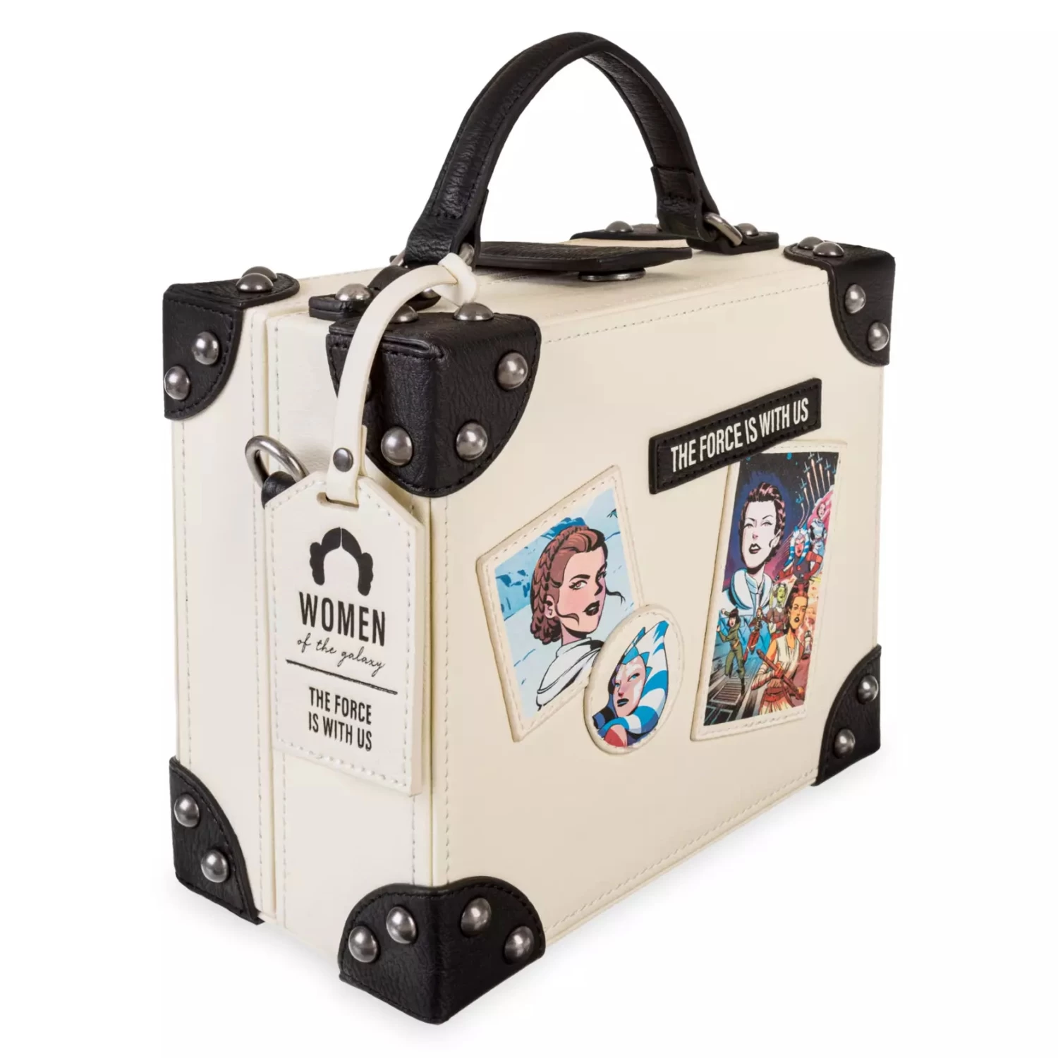 Join the Light side with this white simulated leather travel bag created by Loungefly for our Star Wars Women of the Galaxy Collection, celebrating some of the bravest heroes near and far, far away. With its reinforced corners, the chic and compact design is based on a classic old suitcase. The front has three appliqués featuring our heroines, plus there’s a simulated leather tag with Princess Leia’s iconic hairdo above the slogan ”The Force Is With Us” so you can show off your strong sense of style.