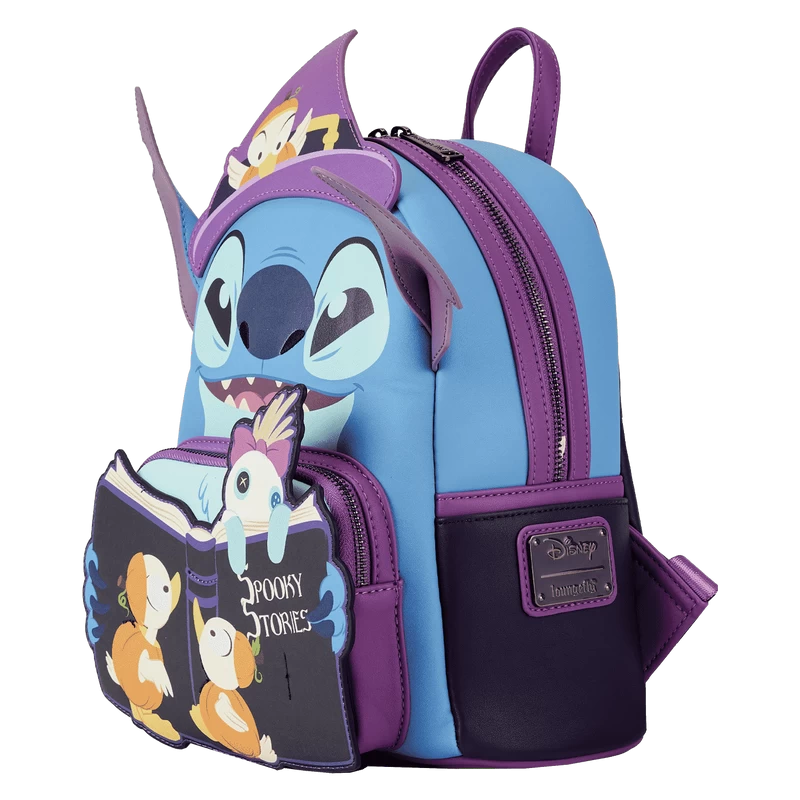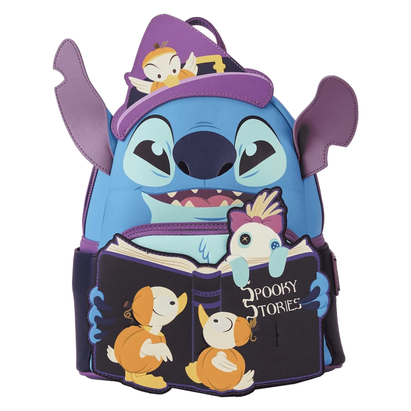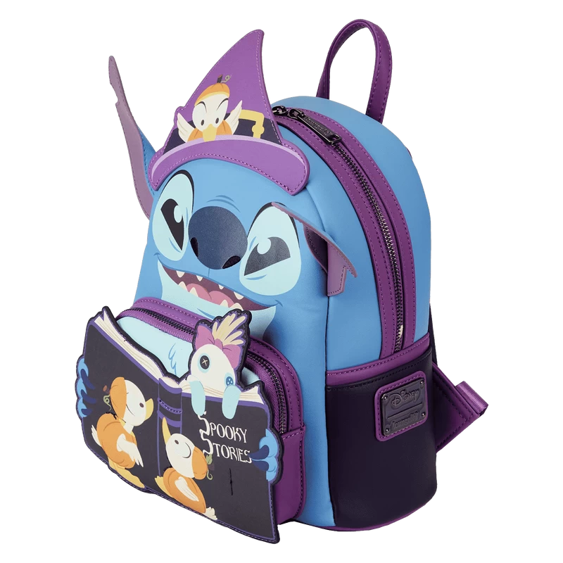 Gather ‘round, it’s time to read a scary story! This loveable alien has gathered his friends for a costume party on the exclusive Loungefly Stitch with Book Halloween Mini Backpack. On the front, Stitch wears a bewitching hat while a duckling peeks out from the brim. Down below, Scrump lounges on a book dressed as a ghost while two other ducklings listen in their pumpkin costumes. Turn down the lights to bring the scene to life with spooky glow-in-the-dark details! On the back, Stitch and the ducklings make an encore appearance. This mini backpack has room to pack all your storybooks and marks a fun new chapter in your Disney wardrobe. Act fast to collect this exclusive Loungefly accessory; supplies are limited.