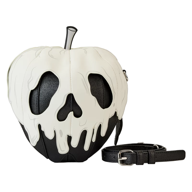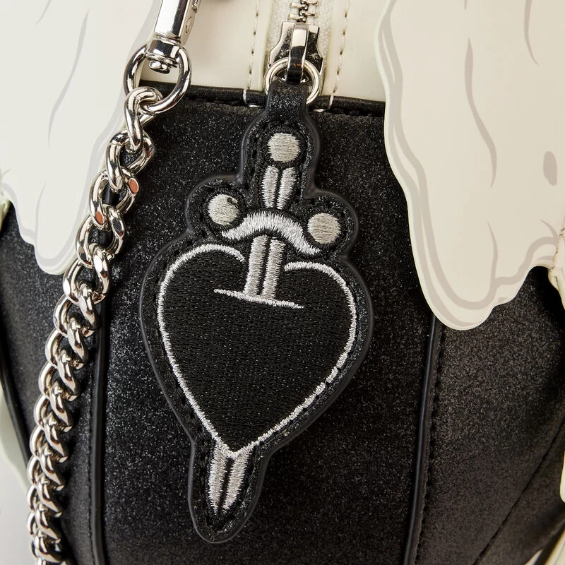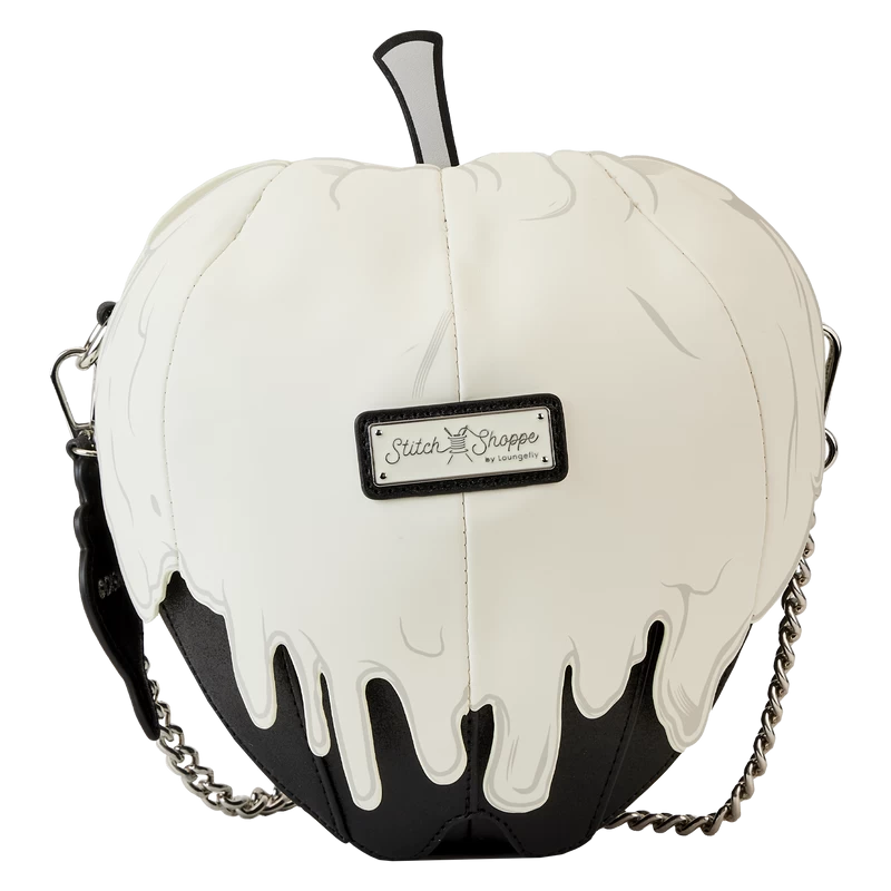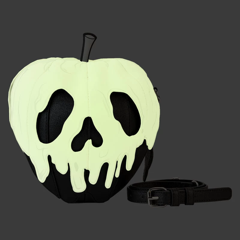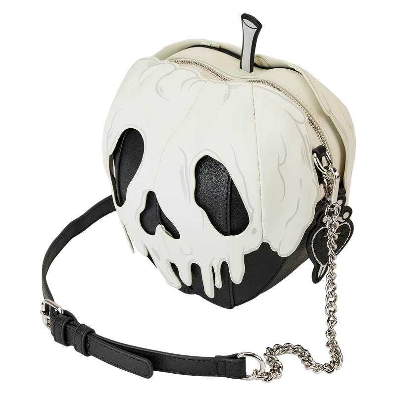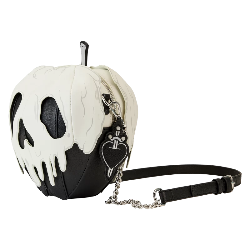 Set your heart on something devilishly delectable. Our exclusive Stitch Shoppe Disney Evil Queen Poison Black Apple Crossbody Bag is ripe for the picking. This fully figural accessory takes on the shape of a poison apple, dripping with a powerful potion that comes to life in applique detail. The black glitter vegan leather contrasts brilliantly with the white potion details on top. Even the stem of the apple pokes up to remain in view. In the dark, the white potion glows! A faux leather charm of a heart with a dagger through it completes the look. Visit your favorite haunts in style and ensure you’re the most wickedly fashionable of them all.