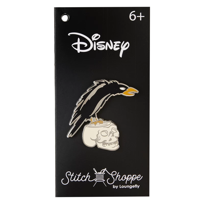 Each bag also comes with a matching 1.5-inch enamel pin of the Raven perched on a skull. This pin, which is only available with this Stitch Shoppe collection, features shiny silver hardware and the classic Loungefly/Funko crown debossing on the back.