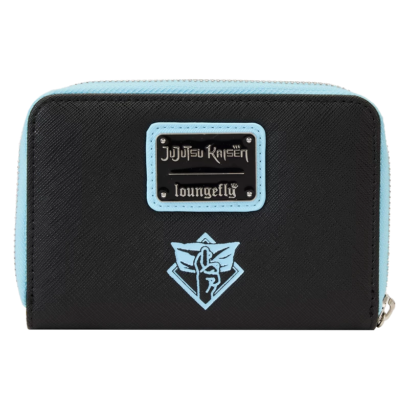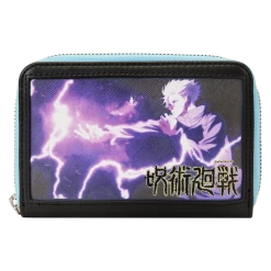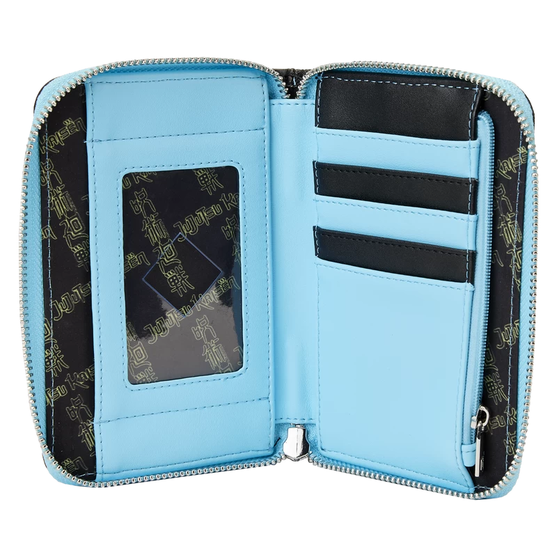 The WonderCon Exclusive Loungefly JUJUSTU KAISEN Satoru Gojo Zip Around Wallet is made of vegan leather (polyurethane). Wallet zips closed with sturdy metal hardware. Additional features include applique, debossed, and printed details. Take note of the coordinating inside lining.